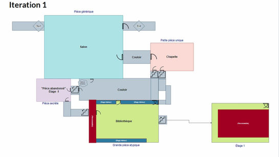 Blockout 3 is built around a certain form of symmetry. All the rooms and corridors except the lounge have access to the 'Transitory' room (in purple). It was also from this blockout that the system of double chapels (in yellow) was set up, which in reality is just one chapel that moves in relation to the progression of the level.