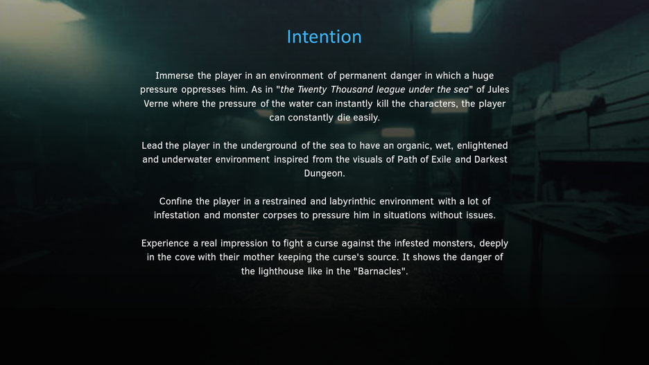 Here is an assignment from my third year at Brassart. It's not particularly detailed, but I find it interesting because of the world it deals with and the very organic structure of the level design that it suggests. This kind of level isn't designed to focus on gameplay, but rather to build up an atmosphere as you go along.